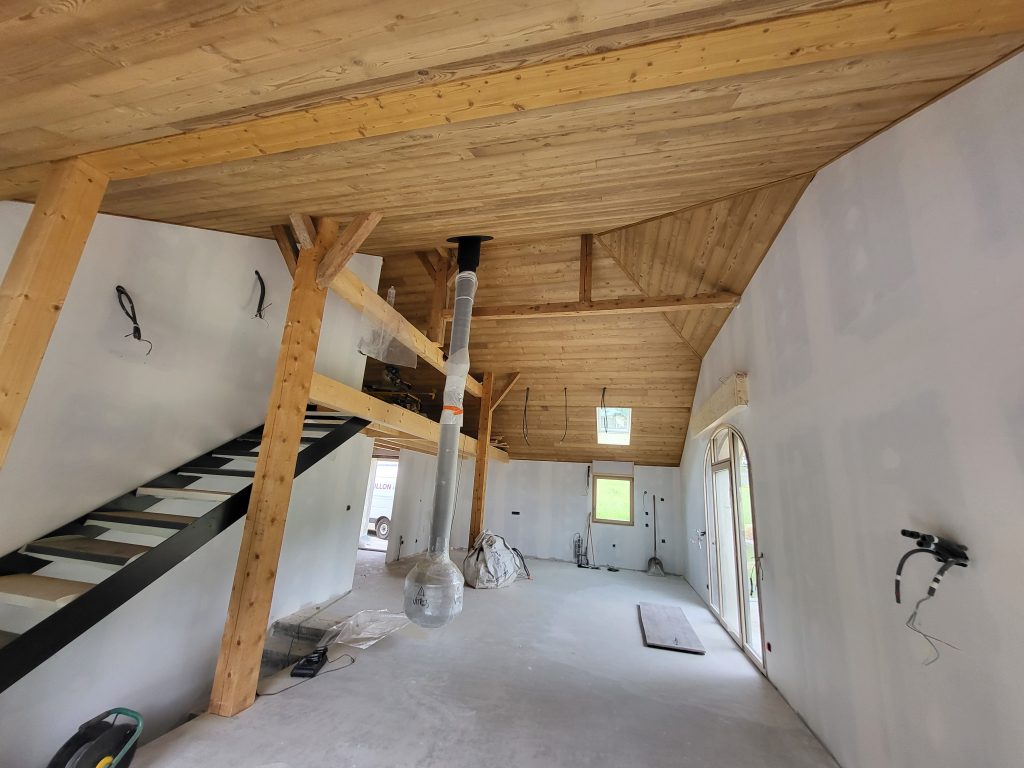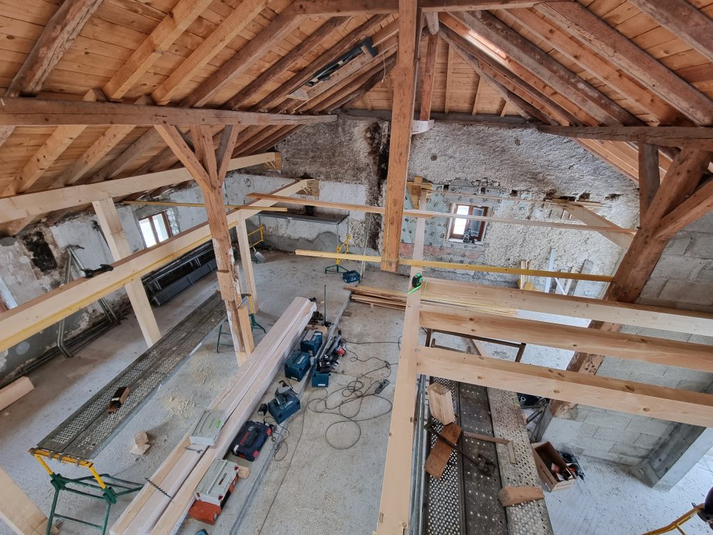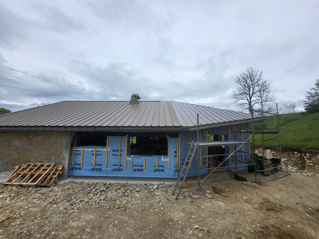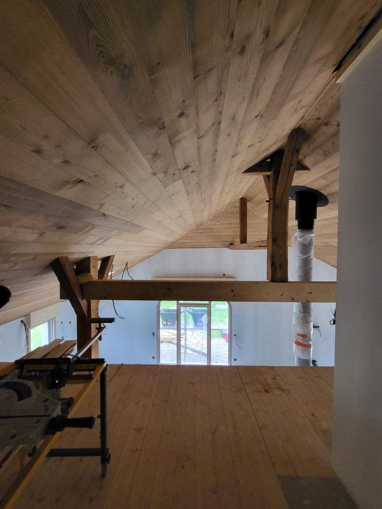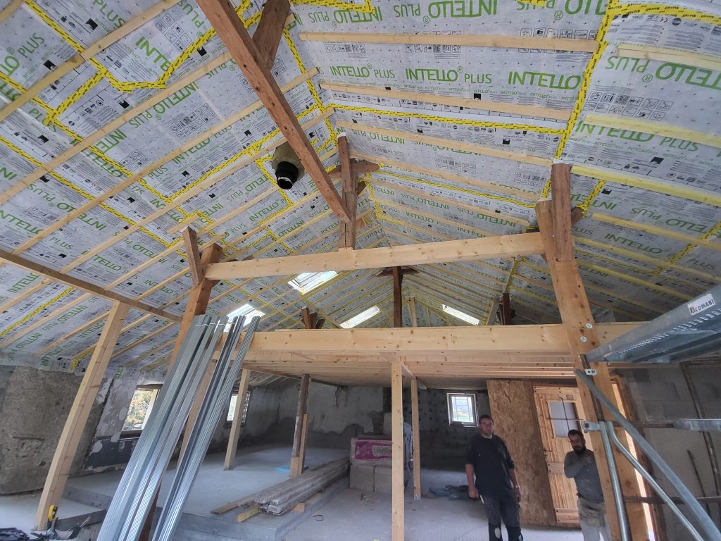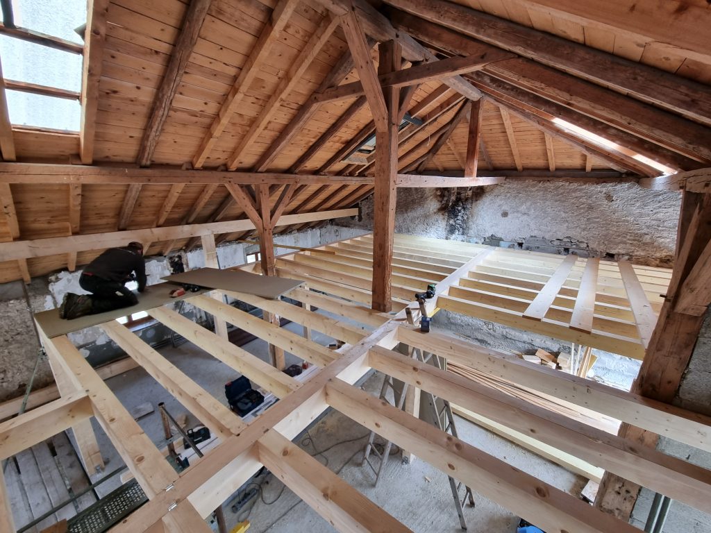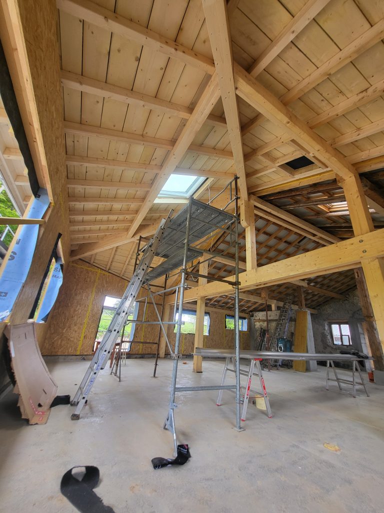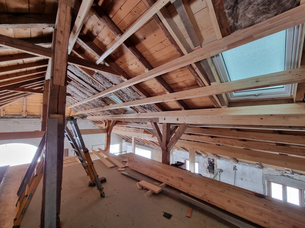 Rénovation d’une ancienne ferme jurassienne, avec réalisation des velux, solivage, isolation de la toiture et parements bois intérieur